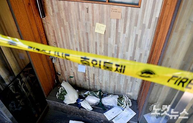 14일 코로나19로 어려움을 겪은 점주가 극단적인 선택을 한 서울 마포의 한 주점 입구에 국화와 함께 '천국 가셔서 돈 걱정 없이 사세요'라고 적힌 메모지들이 붙어있다. 1999년 서울 마포에서 호프집을 시작한 A씨는 코로나로 가게 운영이 어려워지자 본인이 살던 원룸을 빼서 직원들 월급을 내주고, 지난 7일 극단적 선택을 했다. 박종민 기자