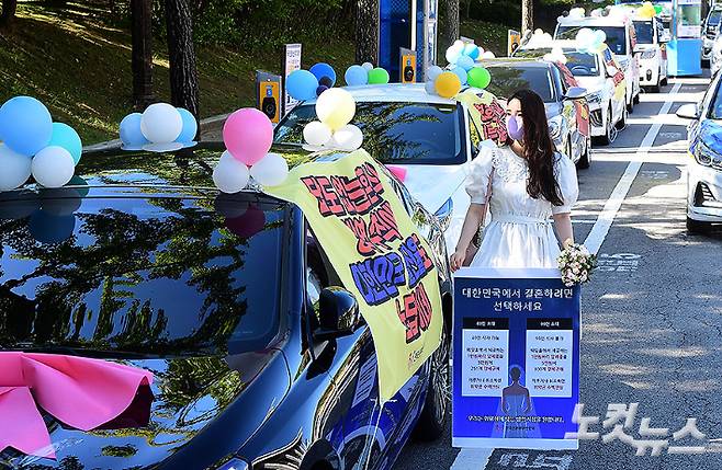 전국신혼부부연합회 소속 한 예비신부가 15일 오전 서울 여의도 KBS 앞 공영주차장에서 정부의 방역지침에 반발하는 '웨딩카 주차 시위' 및 1인 시위를 하고 있다. 신혼부부연합회 관계자들은 웨딩카에 '답도 없는 결혼식 방역 수칙에 대한민국 출산율도 노답이네', '현재의 행복한 결혼이 없다면 미래의 우리 아이도 없습니다' 등의 메시지가 담긴 현수막을 씌웠다. 황진환 기자