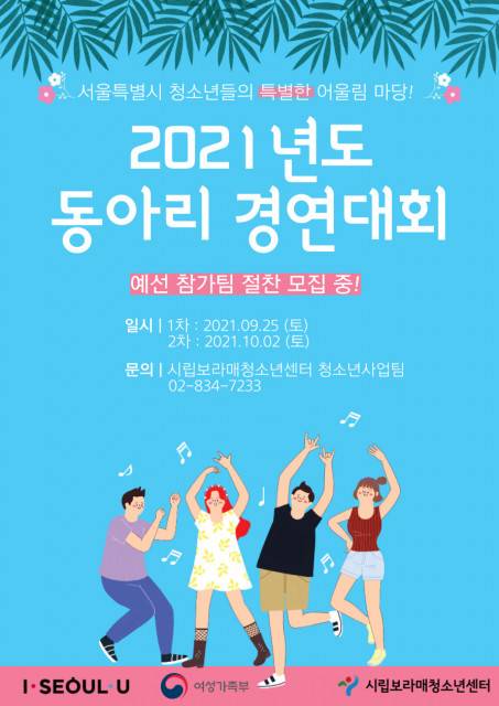 9월 25일, 10월 2일에 개최되는 2021 서울시 청소년 어울림마당 7~8회 ‘청소년 동아리 경연대회 예선’은 서울시 청소년 모두가 함께 하나 돼 어울릴 수 있는 다양한 온라인 경연대회가 기획돼 진행된다.