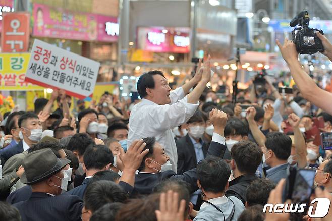 (포항=뉴스1) 최창호 기자 = 윤석열 국민의힘 대통령 경선 후보가 17일 경북 포항시 정치 1번지인 죽도시장에서 지지자들의 성원에 두손을 들어 인사하고 있다. 2021.9.17/뉴스1