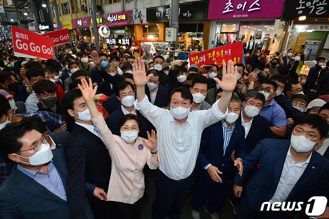 (포항=뉴스1) 최창호 기자 = 윤석열 국민의힘 대통령 경선 후보가 17일 경북 포항시 정치 1번지인 죽도시장에서 지지자들의 성원에 두손을 들어 인사하고 있다. 2021.9.17/뉴스1