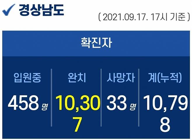17일 오후 5시 기준, 경남도내 입원 중인 확진자는 458명이고, 퇴원 1만 307명, 사망 33명, 누적 확진자는 총 1만 798명이다.