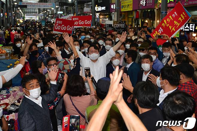 (포항=뉴스1) 최창호 기자 = 윤석열 국민의힘 대통령 경선 후보가 17일 경북 포항시 정치 1번지인 죽도시장에서 지지자들의 성원에 두손을 들어 인사하고 있다. 2021.9.17/뉴스1