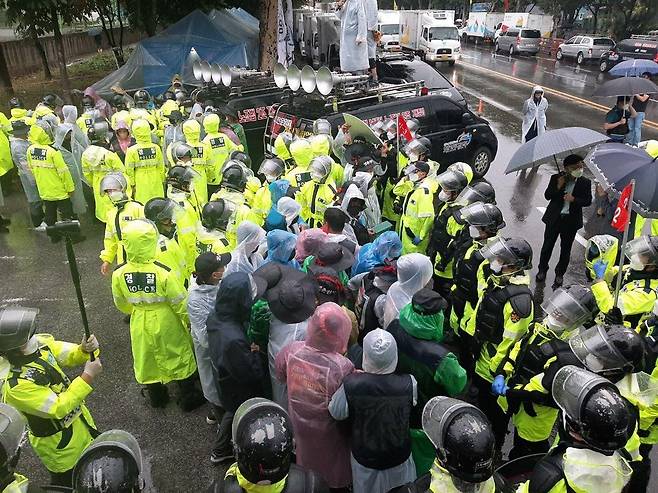 (대구=연합뉴스) 17일 오전 민주노총 공공운수노조 화물연대 대구경북지부 노조원들이 대구 달서구 갈산동 SPC 삼립 대구공장 앞에서 경찰과 대치하고 있다. 2021.9.17