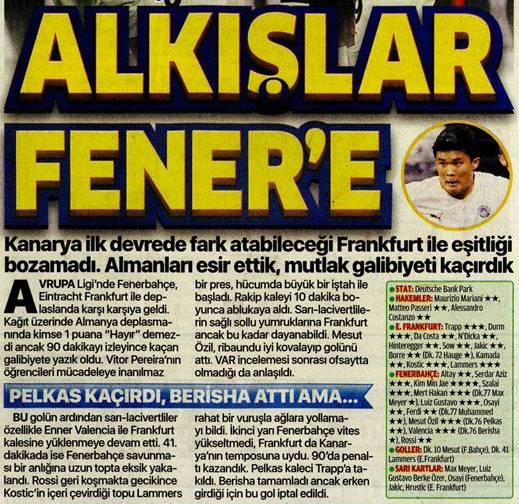 경기 후 터키 매체 '포토맥' 지면판은 두 팀 선수들의 평점을 별점 형태로 매겼는데, 김민재가 별 4개로 최고평점을 받았다. 이는 프랑크푸르트의 득점자 라머르스, 페네르바체의 득점자 메수트 외질보다도 높은 점수다. 별 4개는 김민재 한 명이다.