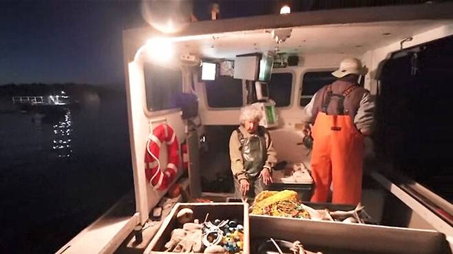 고령의 할머니가 선상에서 능숙하게 랍스터를 손질하고 있습니다.