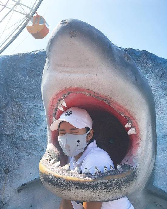 공개된 사진 속 이보미는 테마파크에서 휴식을 즐기는 모습.