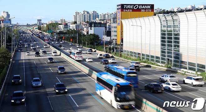 (용인=뉴스1) 김영운 기자 = 추석 연휴를 하루 앞둔 17일 오후 경기도 용인시 신갈분기점 인근 경부고속도로 하행선(왼쪽)이 비교적 원활한 흐름을 보이고 있다. 2021.9.17/뉴스1