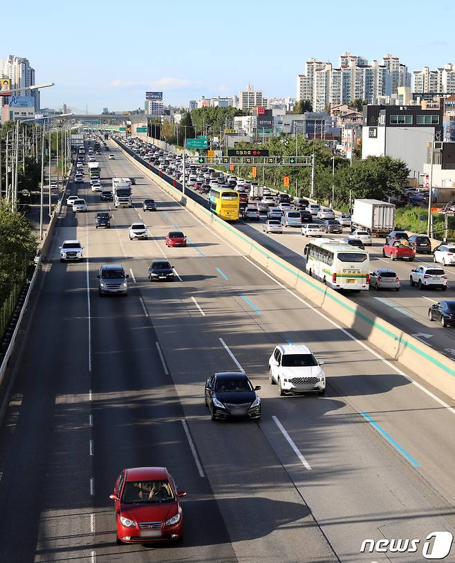 (용인=뉴스1) 김영운 기자 = 추석 연휴를 하루 앞둔 17일 오후 경기도 용인시 신갈분기점 인근 경부고속도로 하행선(왼쪽)이 비교적 원활한 흐름을 보이고 있다. 2021.9.17/뉴스1