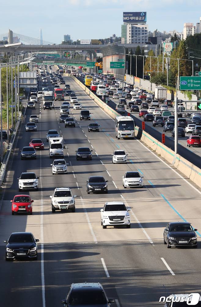 (용인=뉴스1) 김영운 기자 = 추석 연휴를 하루 앞둔 17일 오후 경기도 용인시 신갈분기점 인근 경부고속도로 하행선(왼쪽)이 비교적 원활한 흐름을 보이고 있다. 2021.9.17/뉴스1