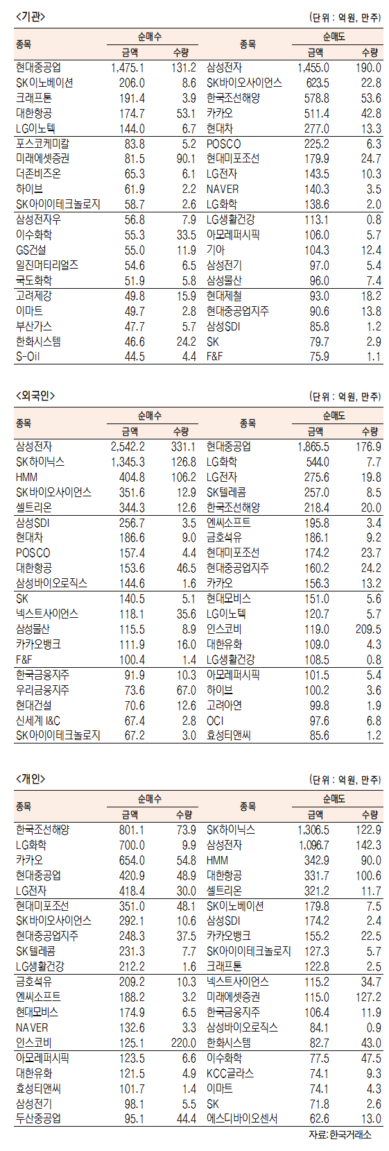 - [표]주간 유가증권 기관·외국인·개인 순매수·도 상위종목(9월 6~10일)