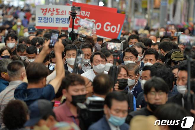 (포항=뉴스1) 최창호 기자 = 윤석열 국민의힘 대통령 경선 후보가 17일 경북 포항시 정치 1번지인 죽도시장에서 지지자들의 환호속에 시장안으로 들어서고 있다. 2021.9.17/뉴스1