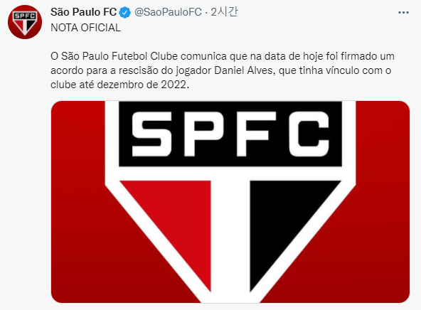 상파울루는 17일(한국시간) 공식 채널을 통해 "2022년 12월까지 함께하기로 했던 알베스와 계약을 해지했다"고 발표했다.