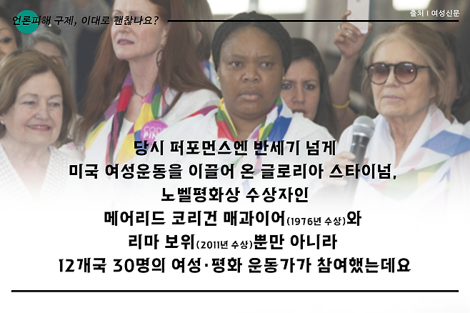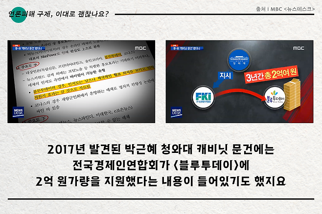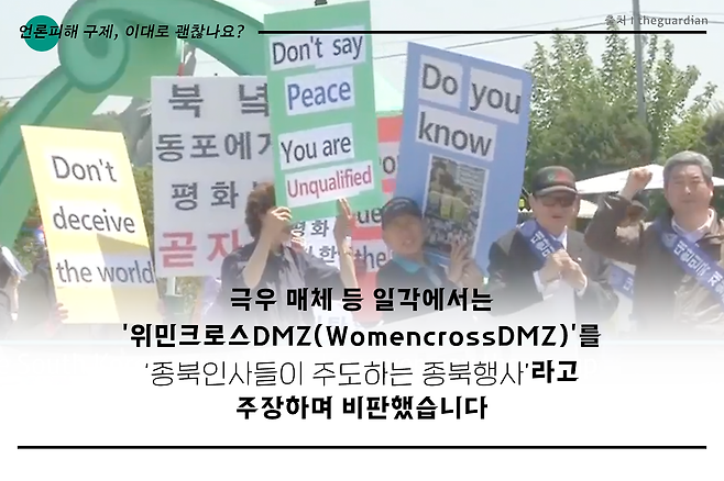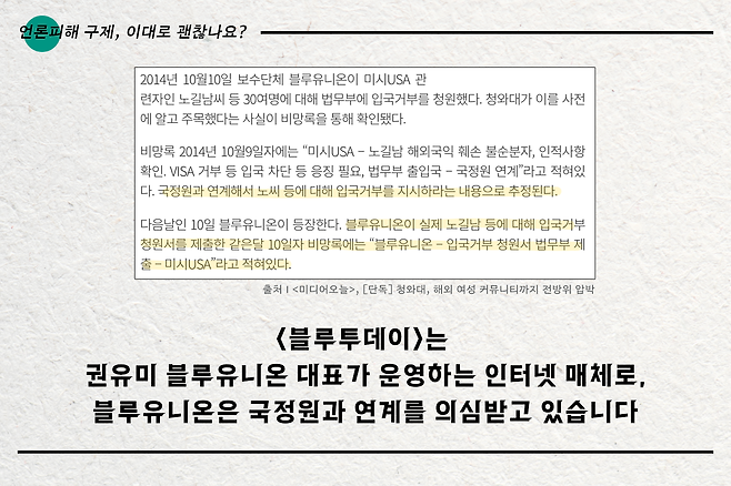 <블루투데이>는 2017년 발견된 박근혜 정부 청와대 캐비닛 문건에 등장하는 극우성향 매체로 2014년부터 2017년까지 3년간 2억 원 가량의 전경련 자금이 지원된 곳으로 드러났습니다. <블루투데이>는 2015년 노벨평화상 수상자와 재미교포가 포함된 세계 여성·평화운동가들이 기획한 '위민크로스DMZ' 행사 참가자들을 '종북 인사'라며 낙인찍었는데요. 특히 '액션포원코리아'(Action for One Korea)라는 단체를 이끄는 정연진 대표를 당시 행사를 주도한 종북인사라고 주장하며 22건이나 되는 기사를 통해 비방했습니다.