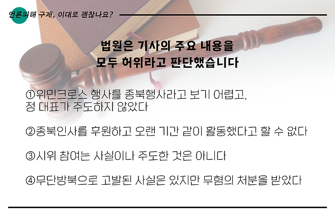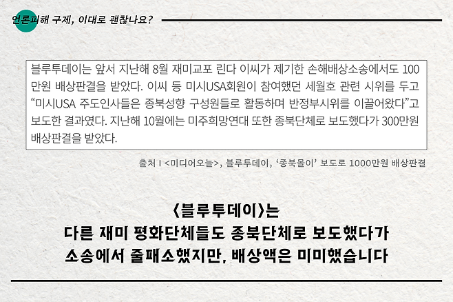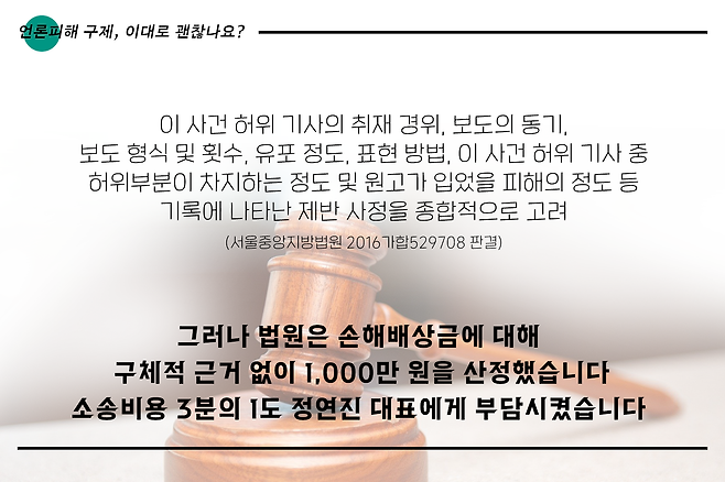 정연진 대표는 <블루투데이>를 상대로 4400만 원의 손해배상금을 청구하는 소송을 냈는데요. 결과는 어땠을까요? 카드뉴스에서 확인하세요.