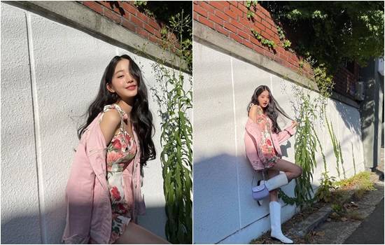 공개된 사진 속 장원영은 핑크색 재킷에 플라워 패턴의 원피스를 입고 포즈를 취하고 있는 모습.