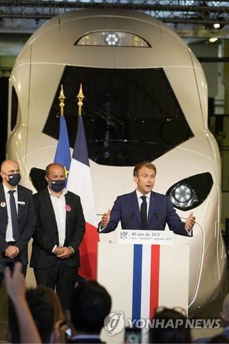 epa09472960 French President Emmanuel Macron speaks in front of a life-size replica of the next high-speed train TGV, at the Gare de Lyon station in Paris, France, 17 September 2021. SNCF unveiled the next generation of its high-speed TGV trains. EPA/Michel Euler / POOL MAXPPP OUT