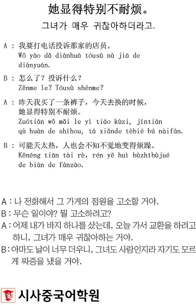 [시사중국어학원의 리얼 중국어 회화] 그녀가 매우 귀찮아하더라고.