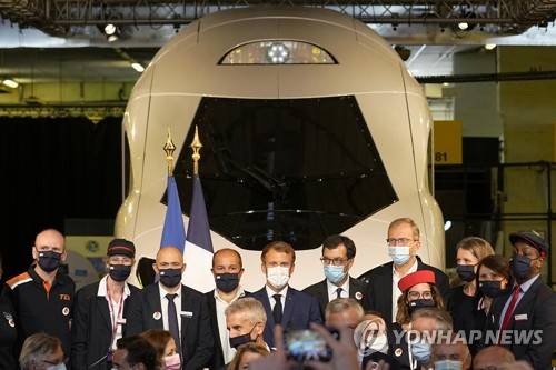 epa09472967 French President Emmanuel Macron, center, and other executives pose in front of a life-size replica of the next high-speed train TGV, at the Gare de Lyon station in Paris, France, 17 September 2021. SNCF unveiled the next generation of its high-speed TGV trains. EPA/Michel Euler / POOL MAXPPP OUT