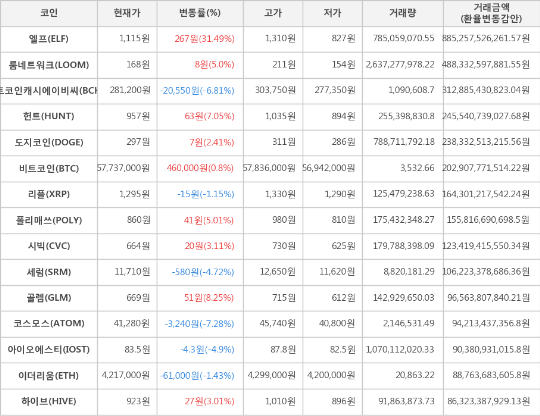 [표]가상화폐 시세 (제공: 암호화폐 거래소 업비트)