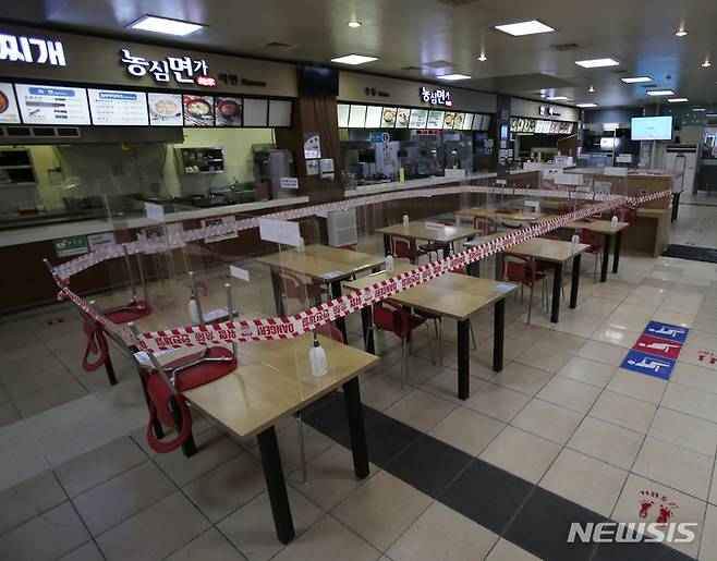 [춘천=뉴시스] 김경목 기자 = 추석연휴를 하루 앞둔 17일 오후 강원 춘천시 중앙고속도로 부산 방향 춘천휴게소 내 실내 취식이 금지되면서 테이블 이용을 못하도록 테이프가 둘러쳐져 있다. 한국도로공사 강원본부는 코로나19 확산 방지를 위해 17~22일 휴게소 실내 취식을 금지했다. 2021.09.17. photo31@newsis.com