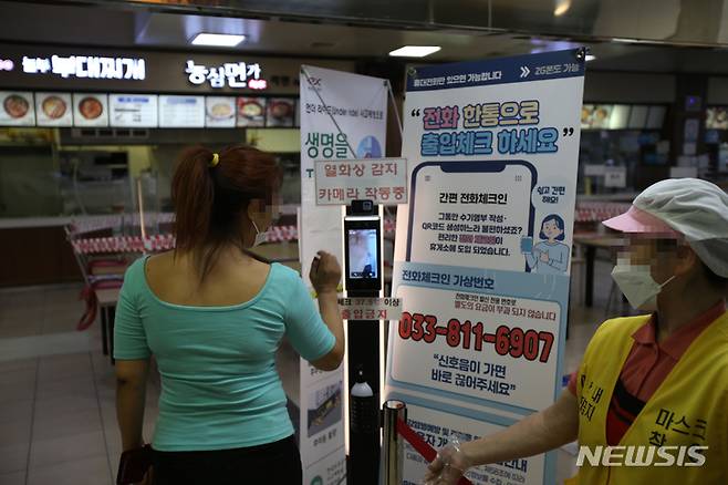 [춘천=뉴시스] 김경목 기자 = 추석연휴를 하루 앞둔 17일 오후 한 여성이 강원 춘천시 중앙고속도로 부산 방향 춘천휴게소 입장 전 발열 체크를 하고 있다. 2021.09.17. photo31@newsis.com