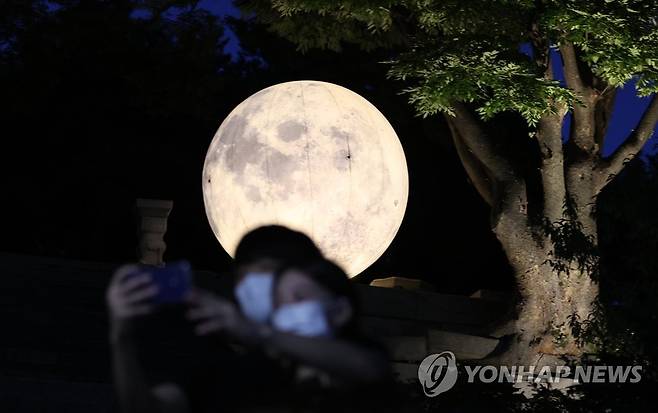 (서울=연합뉴스) 서명곤 기자 = 17일 오후 서울 종로구 창경궁 풍기대 주변에 대형 보름달 모형이 설치돼있다.