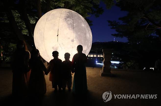 (서울=연합뉴스) 서명곤 기자 = 17일 오후 서울 종로구 창경궁 풍기대 주변에 대형 보름달 모형이 설치돼있다.
