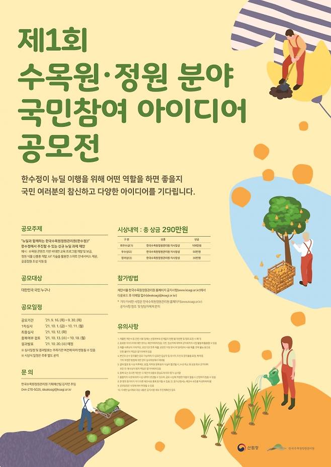 [세종=쿠키뉴스] 최문갑 기자 = 한국수목원정원관리원(이사장 류광수·한수정)은 한국판 뉴딜 실천을 위해 ‘수목원·정원 분야 국민 참여 아이디어 공모전’을 오는 30일까지 연다(포스터).