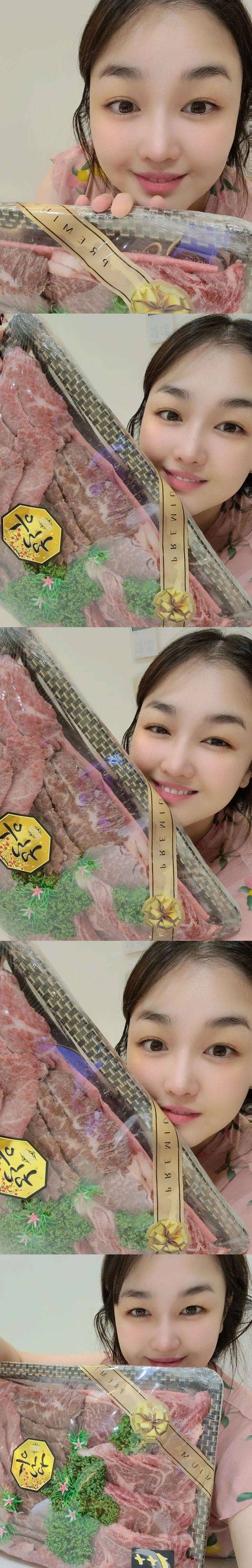 공개된 사진은 정미애가 선물로 받은 한우를 들고 웃고 있는 모습.