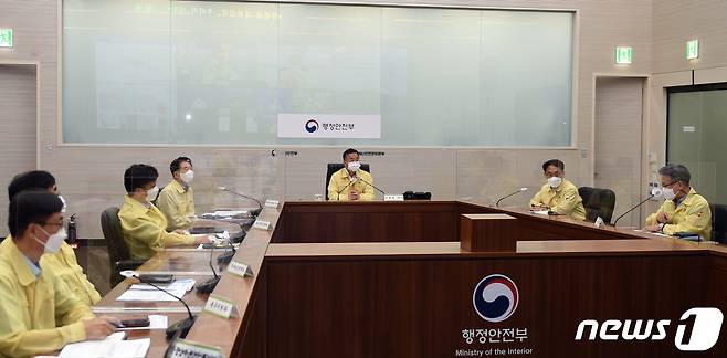 (서울=뉴스1) 이승배 기자 = 이승우 행정안전부 재난안전관리본부장이 17일 오후 세종시 정부세종청사 중앙재난안전상황실에서 제14호 태풍 찬투 북상에 따른 피해 및 현장 상황 관련 긴급 대책 영상회의를 주재하고 있다. (행정안전부 제공) 2021.9.17/뉴스1