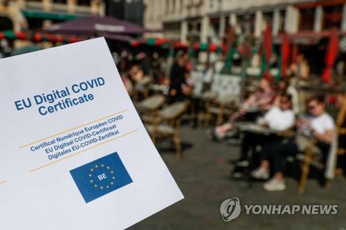 epa09473237 A person holds EU Digital COVID Certificate in Brussels city center, Belgium, 17 September 2021. The health pass will come into effect in Belgium from 01 October, for a period of three months. The sectors concerned are the hotel and catering industry, the events sector, sport and culture. Residents will also have to show the health pass for any event with more than 50 people inside. EPA/STEPHANIE LECOCQ