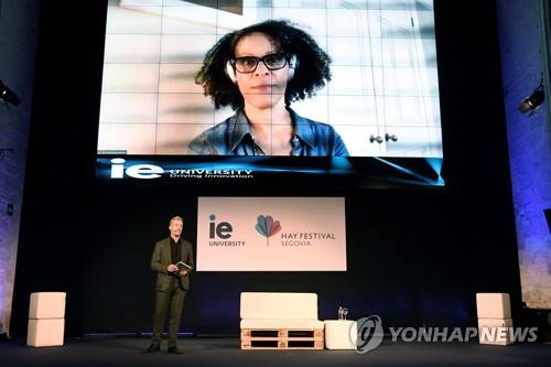 epa09473254 British-Nigerian author Bernardine Evaristo (on screen) takes part via video conference in a debate on Afro literature with the director of Arts of the British Council, Ludovic Assemat, during the Hay Festival of Literature in Segovia, Spain, 17 September 2021. The event runs from 16 to 19 September 202. EPA/PABLO MARTIN