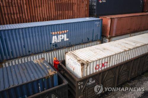 epa09473298 A photo made with a drone shows a the containers being loaded to the train to Kazakhstan in the China-Kazakhstan Logistic Base during the organised media tour in Lianyungang, Jiangsu province, China, 17 September 2021. China-Kazakhstan Logistic Base