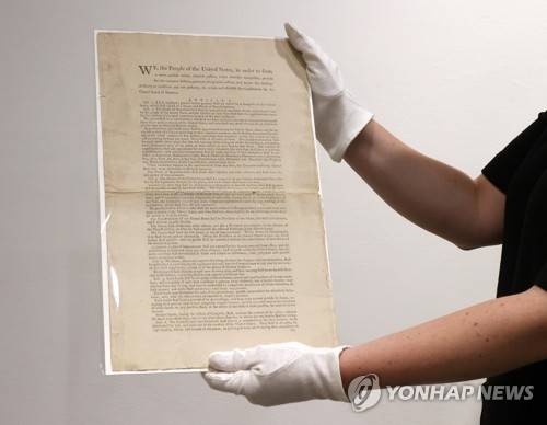 epa09473329 A specialist in books and manuscripts at Sotheby's holds a printed copy of the 1787 U.S. Constitution during a preview of an upcoming auction at Sotheby's in New York, New York, USA, 17 September 2021. The historical document is expected to sell for an estimated 15-20 Million USD in November. The auction is to coincide with Constitution Day, 234 years since America's Founding Fathers signed the country's significant document. It is also the only copy of the first printing of the Constitution that remains in private hands. EPA/JASON SZENES