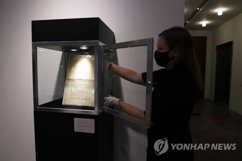 epa09473331 A specialist in books and manuscripts at Sotheby's holds a printed copy of the 1787 U.S. Constitution during a preview of an upcoming auction at Sotheby's in New York, New York, USA, 17 September 2021. The historical document is expected to sell for an estimated 15-20 Million USD in November. The auction is to coincide with Constitution Day, 234 years since America's Founding Fathers signed the country's significant document. It is also the only copy of the first printing of the Constitution that remains in private hands. EPA/JASON SZENES
