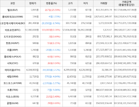 한편 거래금액 기준으로는 엘프, 룸네트워크, 비트코인캐시에이비씨 순으로 가장 활발한 거래를 보이고 있다.