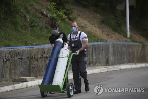 Staff carry oxygen containers for the COVID-19 unit of the Dr. Abdulah Nakas General Hospital in Sarajevo, Bosnia, Friday, Sept. 17, 2021. The COVID-19 rate of infections in Bosnia, a country where only about 12% of the population is fully vaccinated against COVID-19, is on the rise, authorities reported on Friday more than 900 new infections and 30 fatalities over the past 24 hours. (AP Photo)