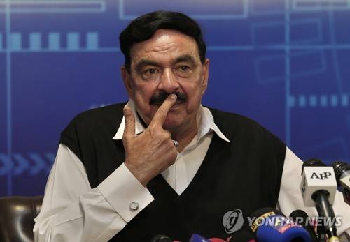 Pakistan's Interior Minister Sheikh Rasheed Ahmed pauses during a press conference regarding the abandoning of New Zealand cricket team's tour, in Islamabad, Pakistan, Pakistan, Friday, Sept. 17, 2021. New Zealand abandoned its cricket tour of Pakistan over security concerns that mystified the hosts, just before the Black Caps' first scheduled match in Pakistan in 18 years. (AP Photo/Anjum Naveed)