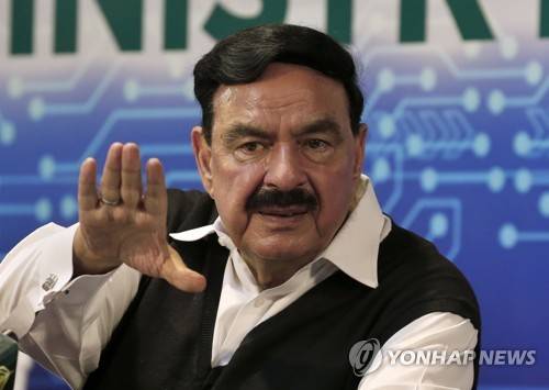 Pakistan's Interior Minister Sheikh Rasheed Ahmed gestures during a press conference regarding the abandoning of New Zealand cricket team's tour, in Islamabad, Pakistan, Pakistan, Friday, Sept. 17, 2021. New Zealand abandoned its cricket tour of Pakistan over security concerns that mystified the hosts, just before the Black Caps' first scheduled match in Pakistan in 18 years. (AP Photo/Anjum Naveed)