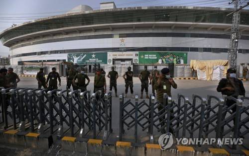 Pakistan paramilitary troops and police officer stand guard outside the Pindi Cricket Stadium following canceling of 1st one day international cricket match between Pakistan and New Zealand, in Rawalpindi, Pakistan, Friday, Sept. 17, 2021. New Zealand abandoned its cricket tour of Pakistan over security concerns that mystified the hosts, just before the Black Caps' first scheduled match in Pakistan in 18 years. (AP Photo/Anjum Naveed)