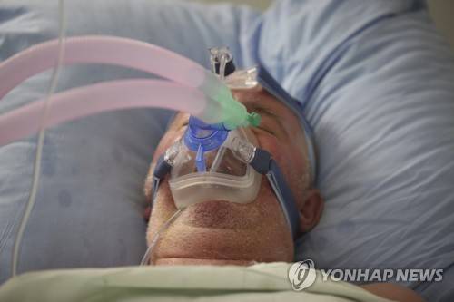 A patient breathes through an oxygen mask at the COVID-19 ICU unit of the Dr. Abdulah Nakas General Hospital in Sarajevo, Bosnia, Friday, Sept. 17, 2021. The COVID-19 rate of infections in Bosnia, a country where only about 12% of the population is fully vaccinated against COVID-19, is on the rise, authorities reported on Friday more than 900 new infections and 30 fatalities over the past 24 hours. (AP Photo)