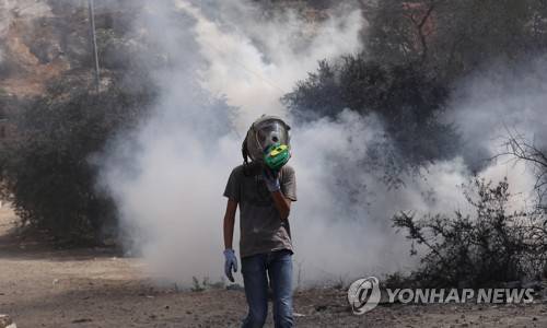 epa09473355 A Palestinian protester seeks cover from tear gas during clashes with Israeli forces after a protest against Israeli settlements on the lands of Beita village, near the West Bank city of Nablus, 17 September 2021. EPA/ALAA BADARNEH