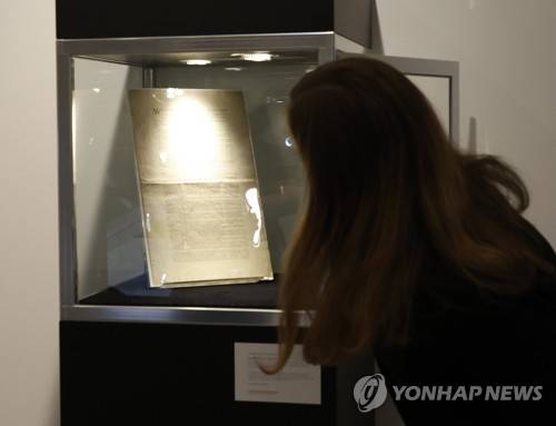 epa09473377 A specialist in books and manuscripts at Sotheby's looks at the first printing of the final text of the 1787 US Constitution during a preview of an upcoming auction at Sotheby's in New York, New York, USA, 17 September 2021. The historical document is expected to sell for an estimated 15-20 Million USD in November. The auction is to coincide with Constitution Day, 234 years since America's Founding Fathers signed the country's significant document. It is also the only copy of the first printing of the Constitution that remains in private hands. EPA/JASON SZENES