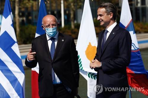 epa09473395 Greek Prime Minister Kyriakos Mitsotakis (R) welcomes Portuguese Foreign Minister Augusto Santos Silva (L), at the EUMed9 Summit, in Athens, Greece, 17 September 2021. The agenda of the Summit, which acquires special geopolitical weight, includes security challenges in the Mediterranean that endanger stability in the region, potential new crises, such as the threat of migration flows after the latest developments in Afghanistan. EPA/YIANNIS KOLESIDIS