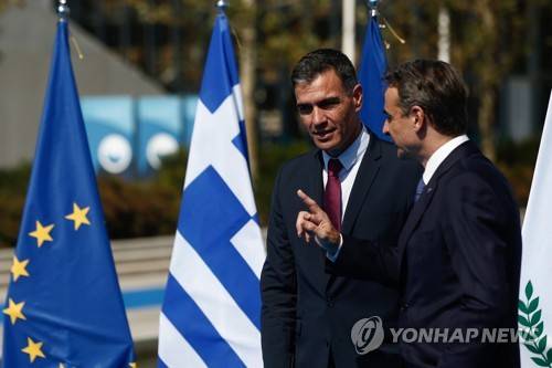 epa09473396 Greek Prime Minister Kyriakos Mitsotakis (R) welcomes Spanish Prime Minister Pedro Sanchez (L), at the EUMed9 Summit, in Athens, Greece, 17 September 2021. The agenda of the Summit, which acquires special geopolitical weight, includes security challenges in the Mediterranean that endanger stability in the region, potential new crises, such as the threat of migration flows after the latest developments in Afghanistan. EPA/YIANNIS KOLESIDIS
