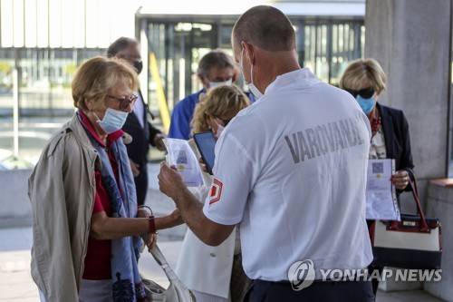 A security person scans COVID-19 certificates of attendees of a political party gathering in Ljubljana, Friday, Sept. 10, 2021. Slovenia has introduced a mandatory anti-COVID vaccination for all civil service employees, further tightening anti-coronavirus measures that have triggered a major riot in the small Alpine state. The measure passed Friday Sept. 17, 2021 says that all state administration employees will need to be vaccinated with one shot by Oct. 1 and by Nov. 1 with the second, unless it's the one-dose Johnson & Johnson vaccine. (AP Photo)