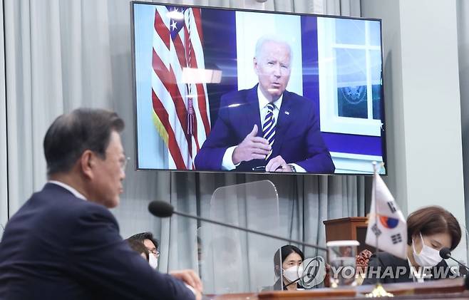 (서울=연합뉴스) 최재구 기자 = 문재인 대통령이 17일 오후 청와대 여민관 영상회의실에서 화상으로 열린 '에너지 및 기후에 관한 주요 경제국 포럼(Major Economies Forum on Energy and Climate, MEF)'에 참석해 조 바이든 미국 대통령의 개회사를 듣고 있다. 2021.9.17