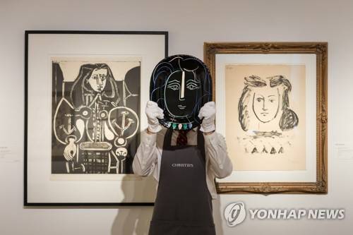 epa09473432 An art handler displays a ceramic plate by Pablo Picasso called 'Visage de Femme' in front of Picasso artworks 'Femme au Fauteuil No.4' (L) and 'Buste de Jeune Fille' (R) at Christie's auction rooms in London, Britain, 17 September 2021. The plate will be up for auction in the Christie's September online only sales. EPA/VICKIE FLORES
