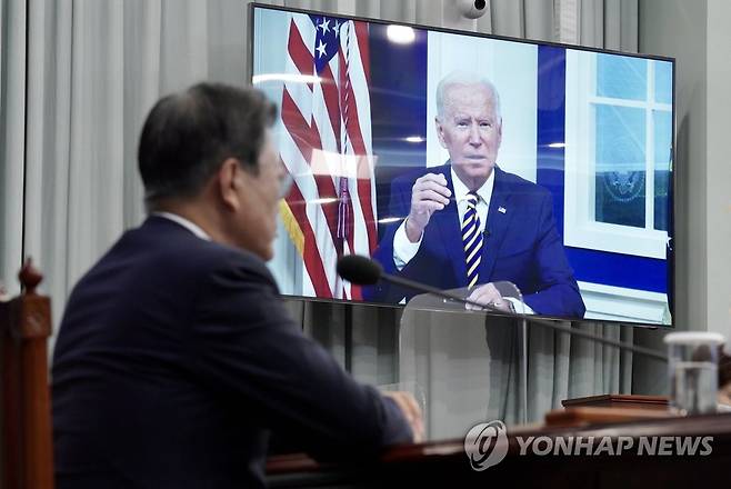 (서울=연합뉴스) 최재구 기자 = 문재인 대통령이 17일 오후 청와대 여민관 영상회의실에서 화상으로 열린 '에너지 및 기후에 관한 주요 경제국 포럼(Major Economies Forum on Energy and Climate, MEF)'에 참석해 조 바이든 미국 대통령의 개회사를 듣고 있다. 2021.9.17